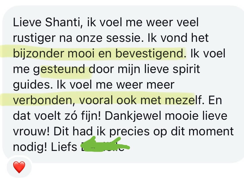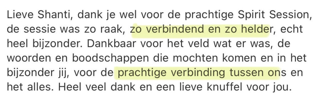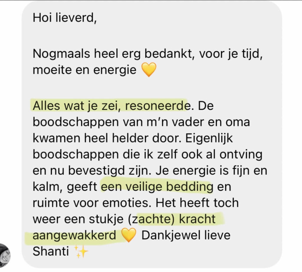 Dat is waarom je dit doet. Niet alleen om informatie te ontvangen, maar om een energetische verschuiving te ervaren. Om te merken dat je anders uit de sessie komt dan je erin ging: lichter, helderder, meer verbonden met jezelf en met Spirit.