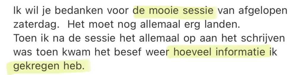 Elke sessie is uniek, helemaal afgestemd op jouw frequentie en op wat jouw ziel op dit moment mag ontvangen. En het mooie is: het klopt altijd met waar jij nu bent in je reis.